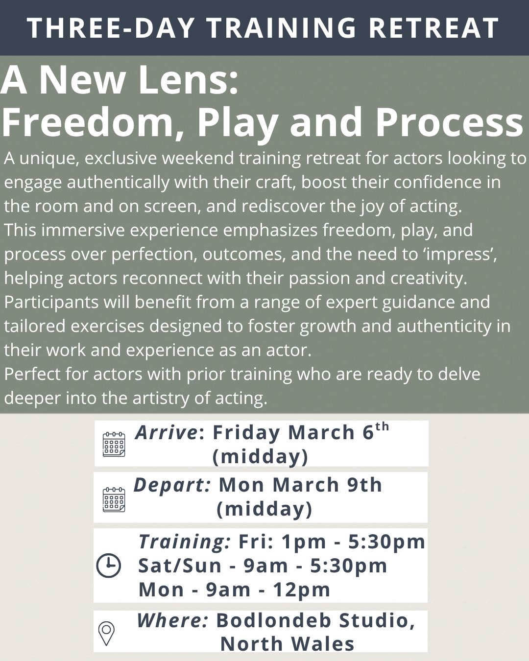 The first ‘A New Lens’ retreat went so brilliantly and was so well received that Steph, Matt and I will be running it again March 2026, with an added third day focussing on career, industry insight, goals, and working through the everyday challenges actors face with a focus on confidence building and a process focus.